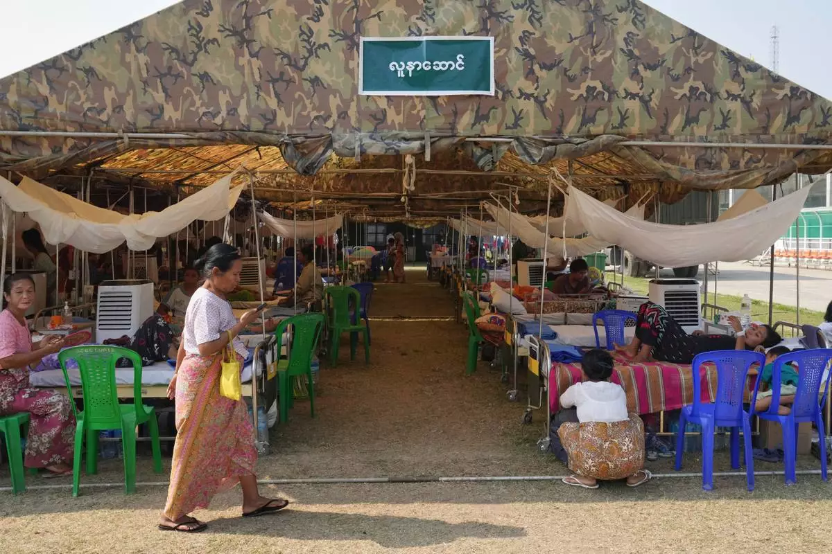 Patients are seen at a make-shift tent opened for medical care after last week's earthquake in Naypyitaw, Myanmar, Friday, April 4, 2025. (AP Photo)