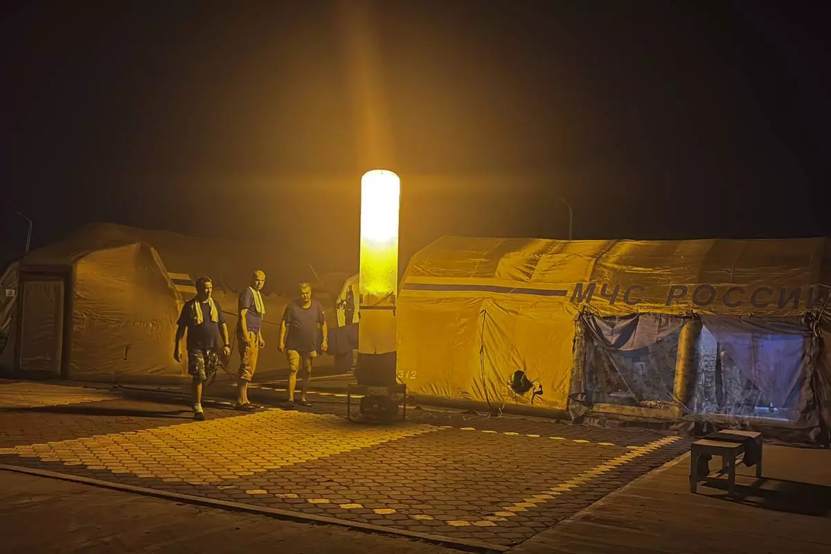 Russian medical volunteers gather near their make-shift tent opened as a medical center in the aftermath of Friday's earthquake in Mandalay, Myanmar, Thursday, April 3, 2025. (AP Photo)