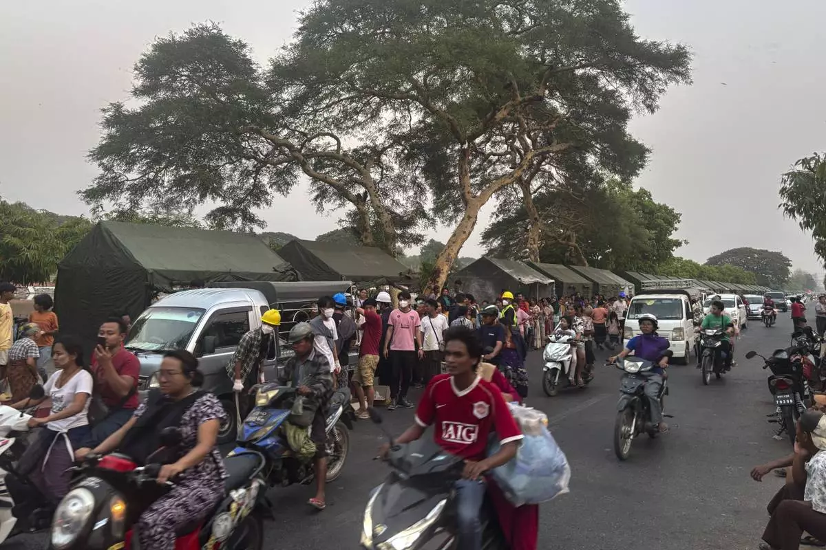 Vehicles make their way on a road while people rest near temporary tents distributed by Myanmar military near Mandalay palace in the aftermath of Friday's earthquake in Mandalay, Myanmar, Wednesday, April 2, 2025. (AP Photo)