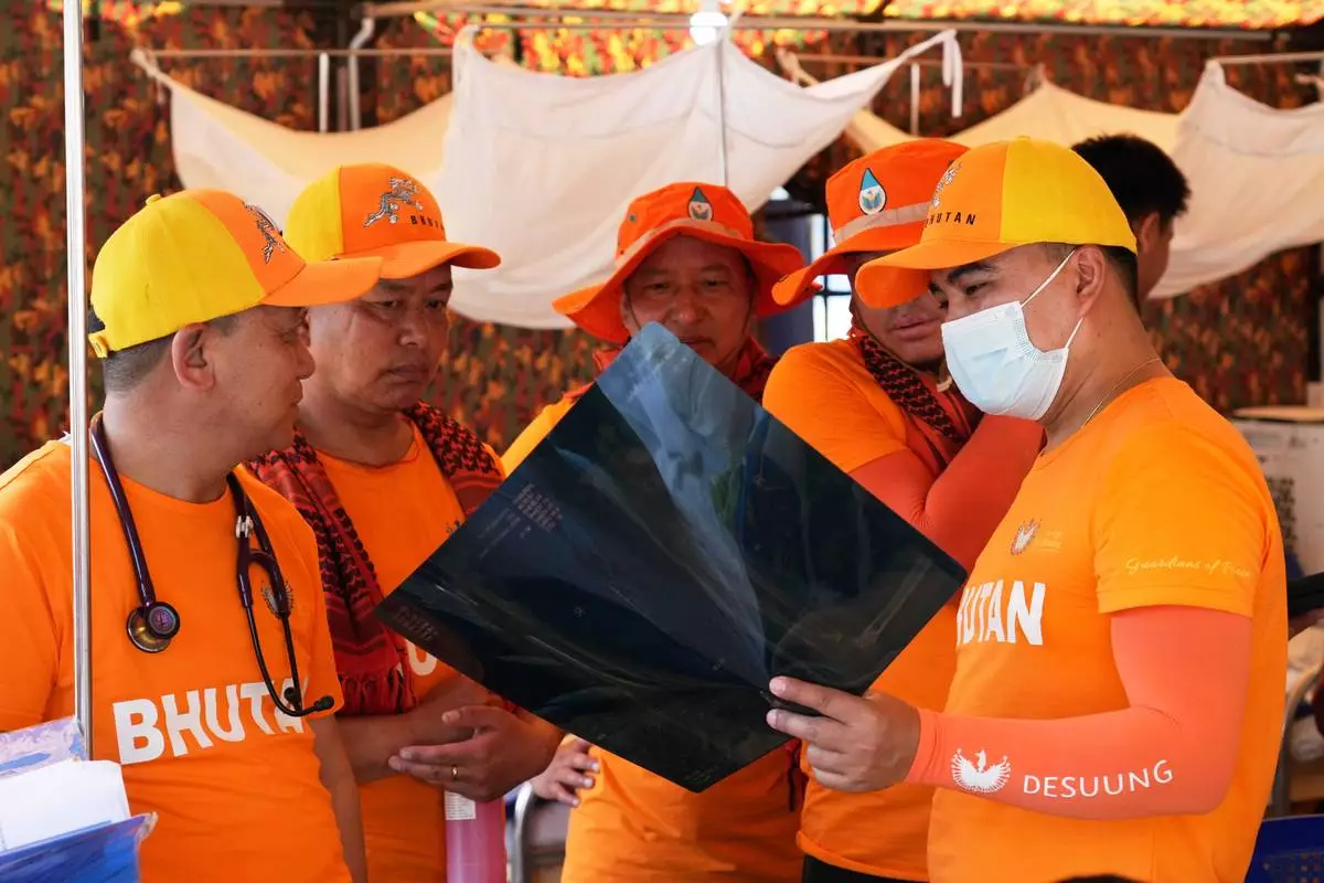 Bhutanese medical volunteers look at the chest scan of a patient at a make-shift tent after last week's earthquake in Naypyitaw, Myanmar, Friday, April 4, 2025. (AP Photo)