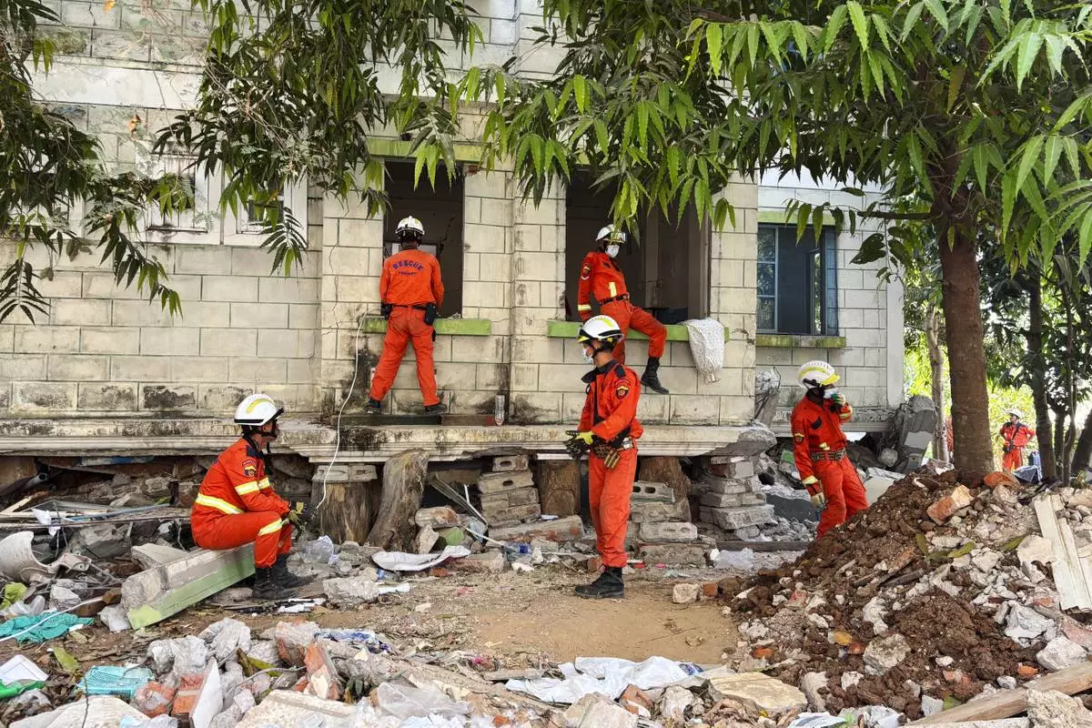 In this photo released by Xinhua News Agency, rescuers carry out search and rescue on the damaged buildings in the aftermath of an earthquake in Mandalay, Myanmar, Monday, March 31, 2025. (Jiang Chao/Xinhua via AP)