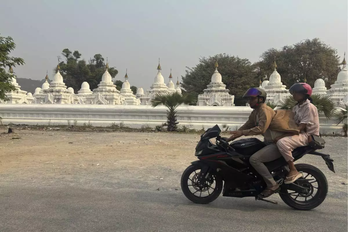 Local residents ride a motorbike past pagodas in the aftermath of Friday's earthquake in Mandalay, Myanmar, Thursday, April 3, 2025. (AP Photo)