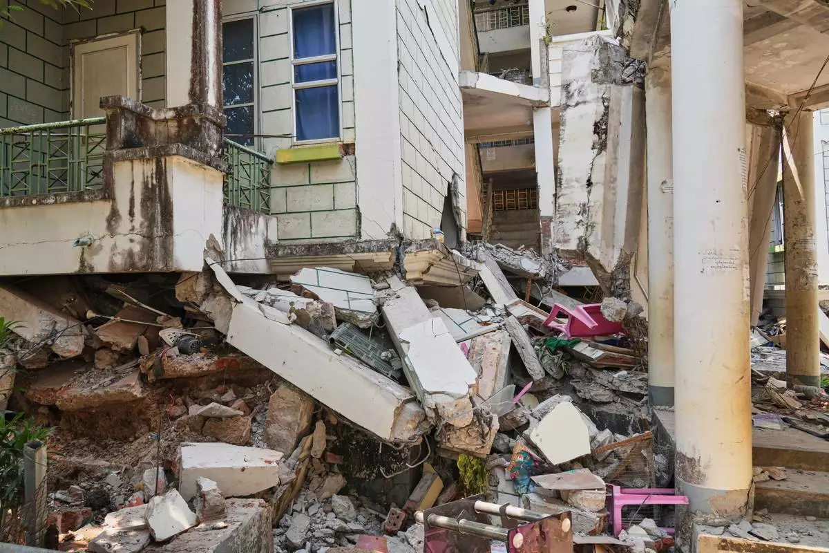 In this photo released by Xinhua News Agency, locals past by a partially damaged building in the aftermath of an earthquake in Mandalay, Myanmar on Saturday, March 29, 2025. (Myo Kyaw Soe/Xinhua via AP)