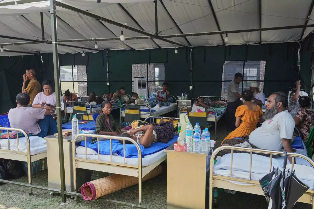 Patient are seen at a make-shift tent opened for medical care after last week's earthquake in Naypyitaw, Myanmar, Friday, April 4, 2025. (AP Photo)