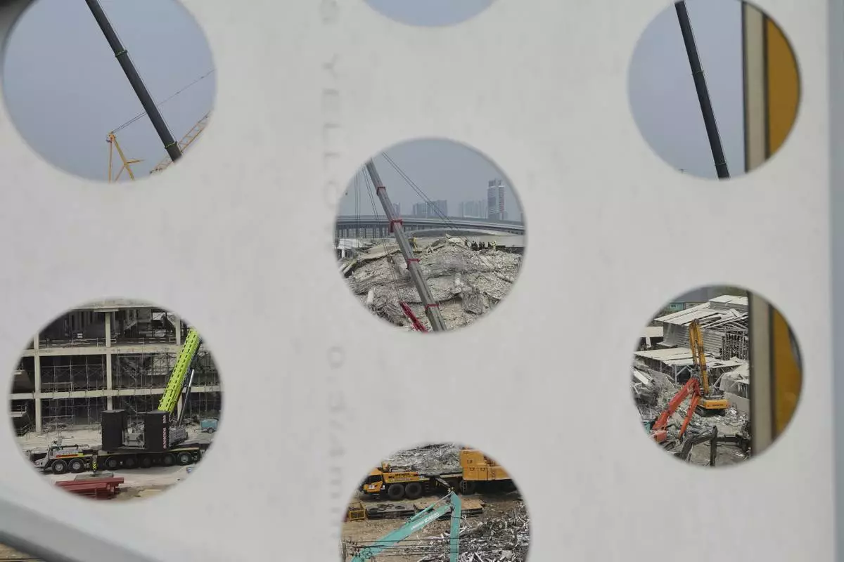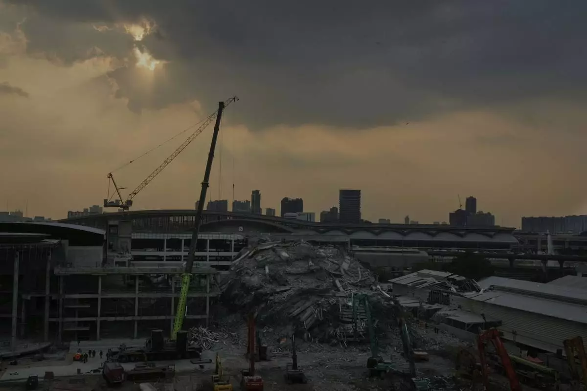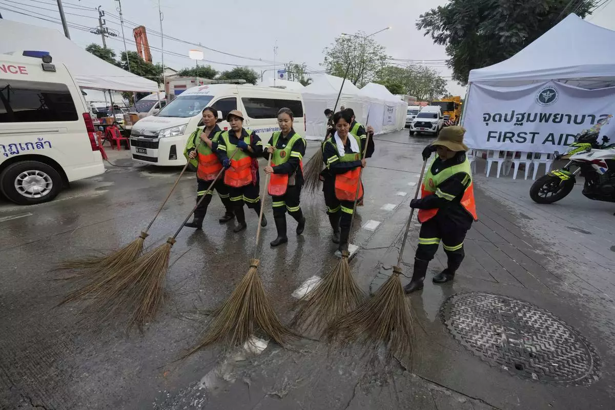Workers clean the area around an under-construction high-rise building that collapsed after an earthquake in Bangkok, Thailand, Tuesday, April 1, 2025. (AP Photo/Manish Swarup)