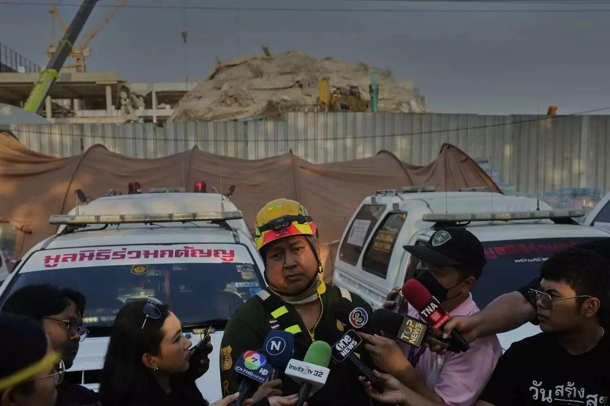 A rescue office Amman Sutthirat talks to media at site of an under construction high-rise building that collapsed after an earthquake in Bangkok, Thailand, Friday, April, 4, 2025. (AP Photo/Manish Swarup)