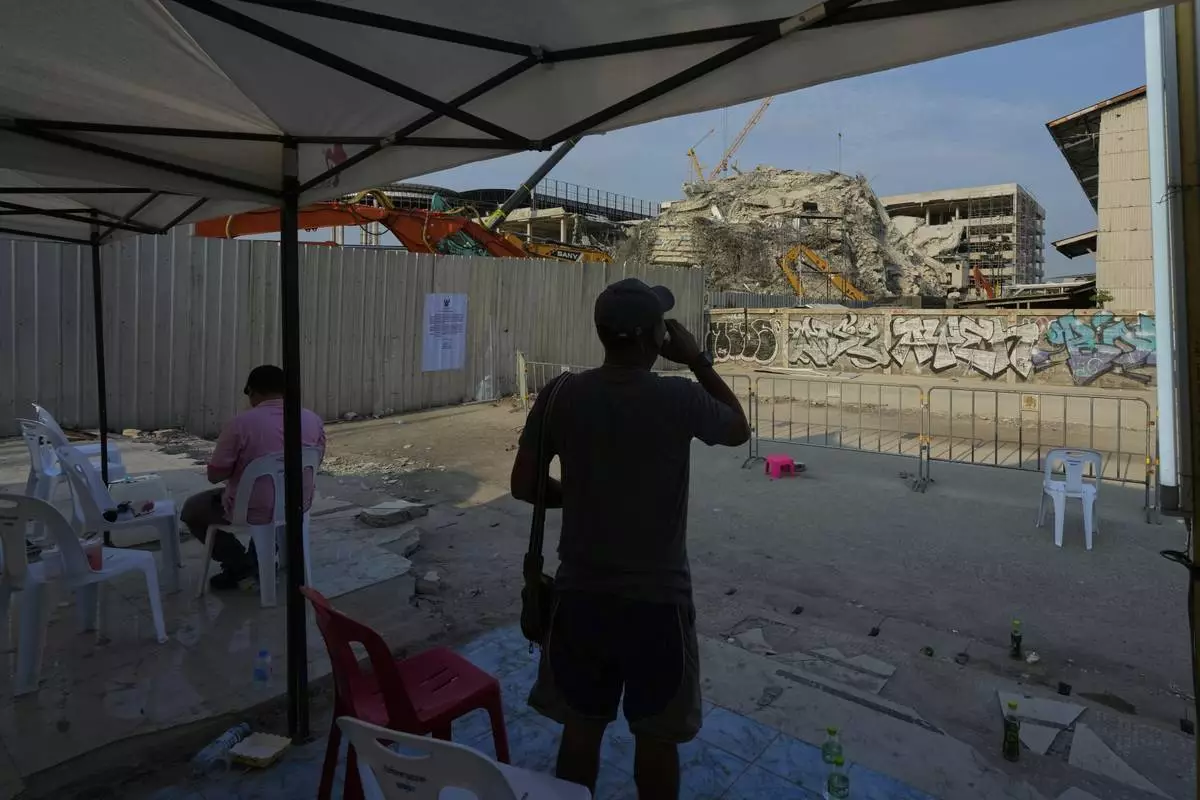People watch rescue work by the site of an under-construction high-rise building that collapsed on Friday after an earthquake in Bangkok, Thailand, Saturday, March 29, 2025. (AP Photo/Manish Swarup)