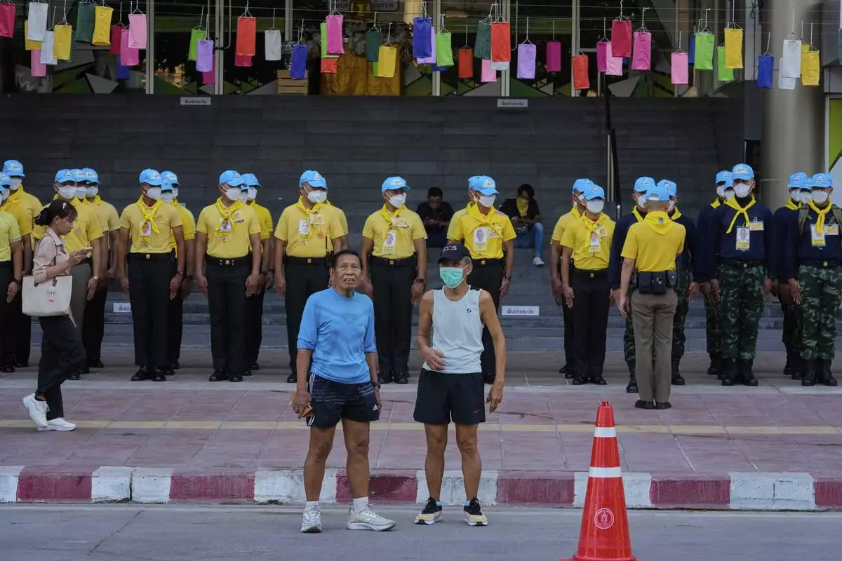 Morning joggers look at the at site of an under construction high-rise building that collapsed after an earthquake, as Thai army soldiers lined up for their duty in Bangkok, Thailand, Friday, April, 4, 2025. (AP Photo/Manish Swarup)