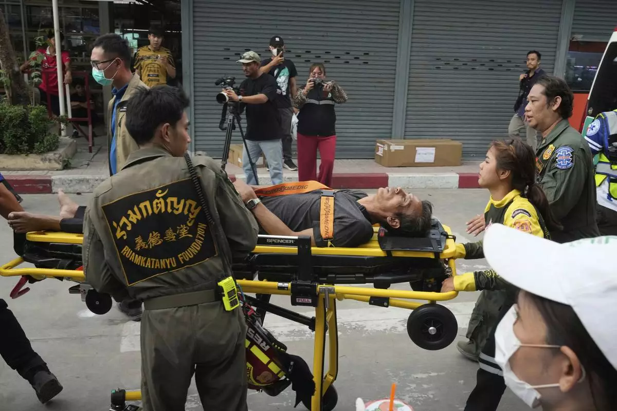 Paramedics take a relative of a missing person who fell unconscious while waiting at the site of an under-construction high-rise building that collapsed after Friday's earthquake in Bangkok, Thailand, Tuesday, April 1, 2025. (AP Photo/Manish Swarup)
