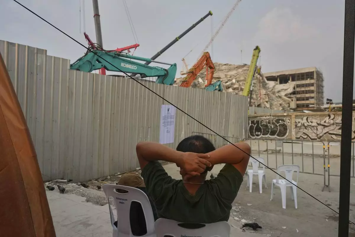 A person watches the site of an under-construction high-rise building that collapsed after an earthquake in Bangkok, Thailand, Wednesday, April 2, 2025. (AP Photo/Manish Swarup)