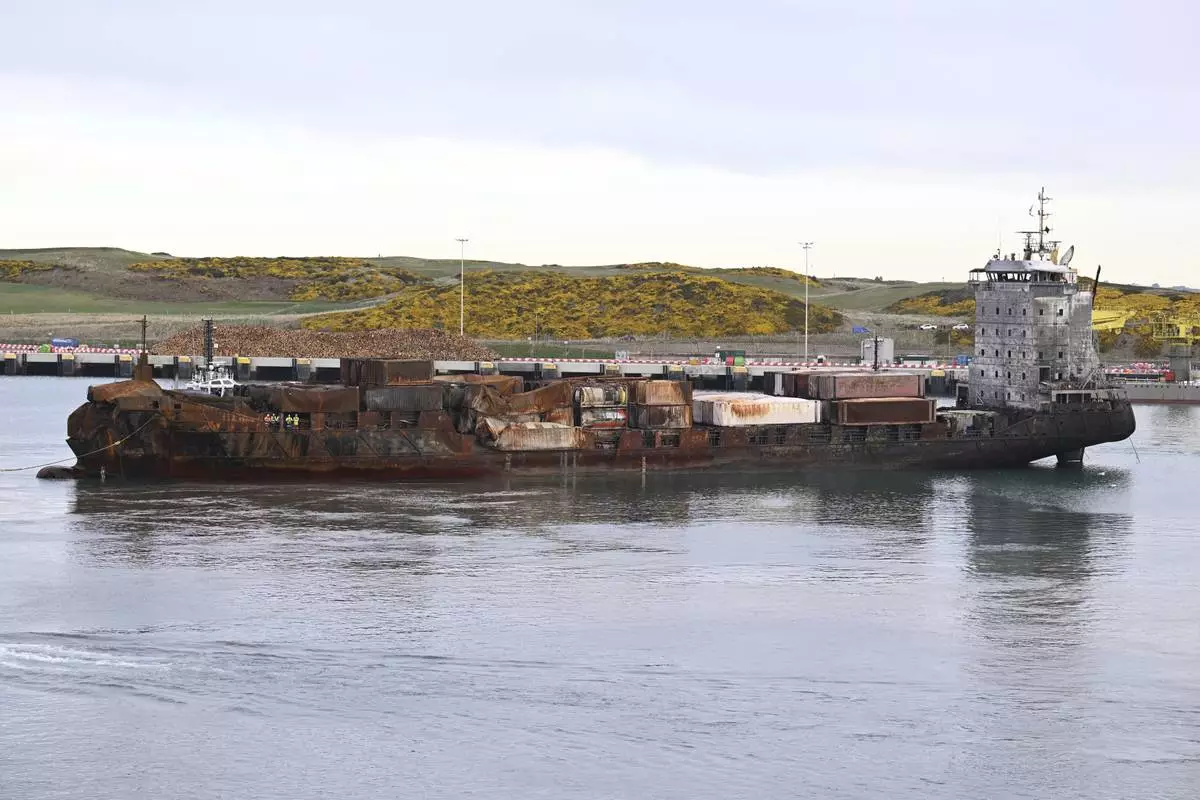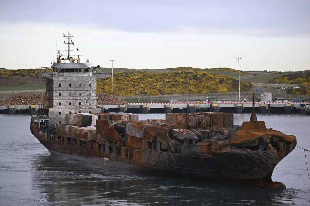 LONDON (AP) — A badly damaged cargo ship which collided with a U.S. tanker in the North Sea earlier this month arrived in the Scottish port of Aberdeen Friday, following a fire that lasted for nearly a week.
