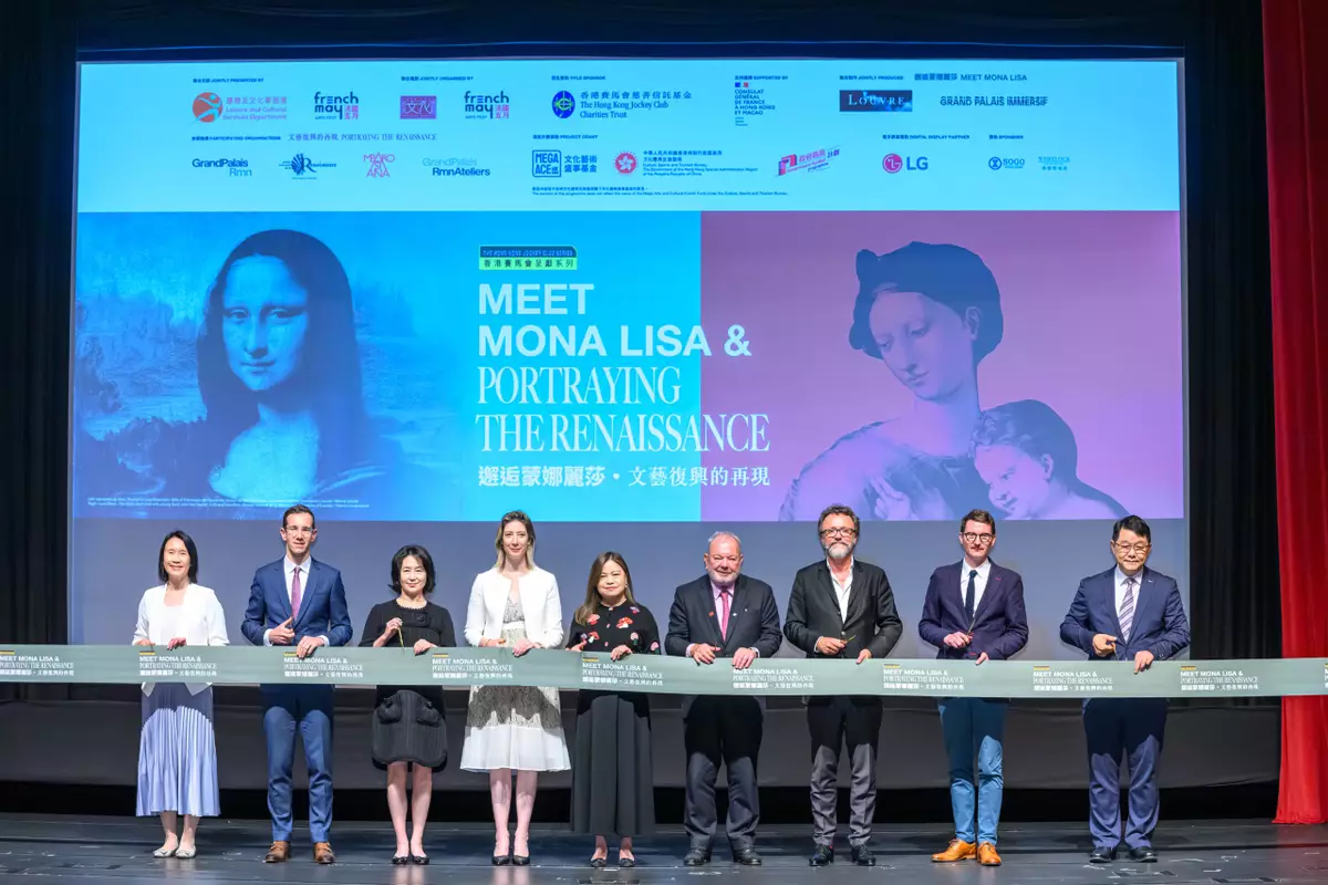 Rosanna Law, HKSAR Government Secretary for Culture, Sports and Tourism (centre); Manda Chan, HKSAR Government Director of Leisure and Cultural Services (1st left); Nicholas Hunsworth, Club Steward (4th right); Christile Drulhe, Consul General of France in Hong Kong and Macau (4th left); Pansy Ho, Co-Chairman of the Board of French May Arts Festival (3rd left); Vincent Larnicol, Vice President of Grand Palais Immersif (3rd right); Vincent Delieuvin, Chief Curator of Italian Painting of the Sixteenth Century of Musée du Louvre (2nd left); Dr Matteo Gianeselli, Curator and Art Historian of Musee de la Renaissance (2nd right); Brian Lam, Museum Director of Hong Kong Heritage Museum (1st right) and other guests at the opening ceremony of The Hong Kong Jockey Club Series: Meet Mona Lisa & Portraying the Renaissance exhibition.