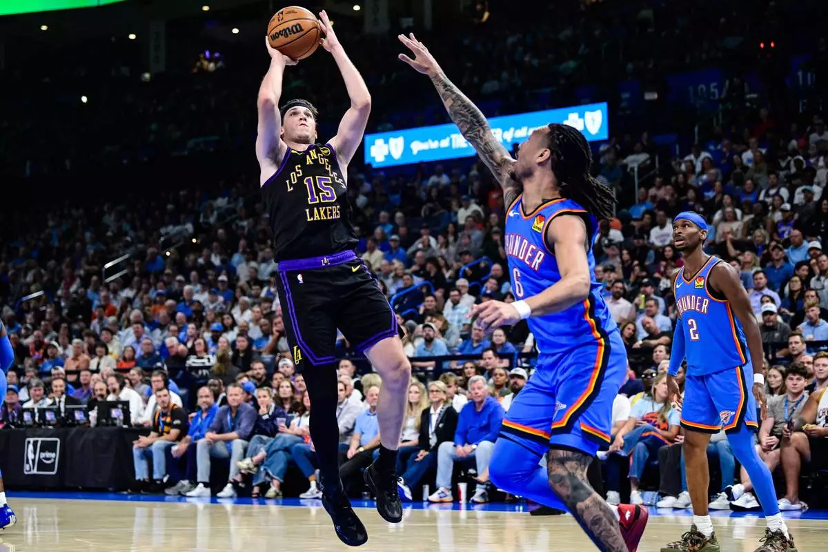 Los Angeles Lakers guard Austin Reaves (15) shoots against Oklahoma City Thunder forward Jaylin Williams (6) during the first half of an NBA basketball game Thursday, April. 2, 2026, in Oklahoma City. (AP Photo/Gerald Leong)
