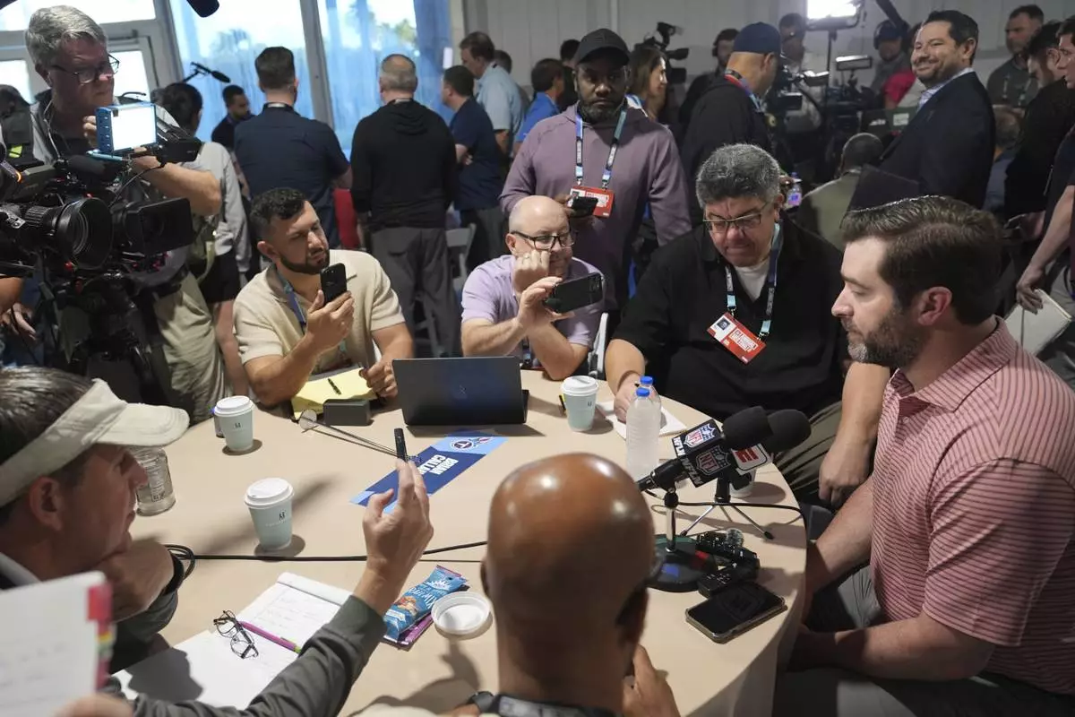 Tennessee Titans head coach Brian Callahan, right, is interviewed at the NFL football annual meetings Monday, March 31, 2025, in Palm Beach, Fla. (AP Photo/Lynne Sladky)