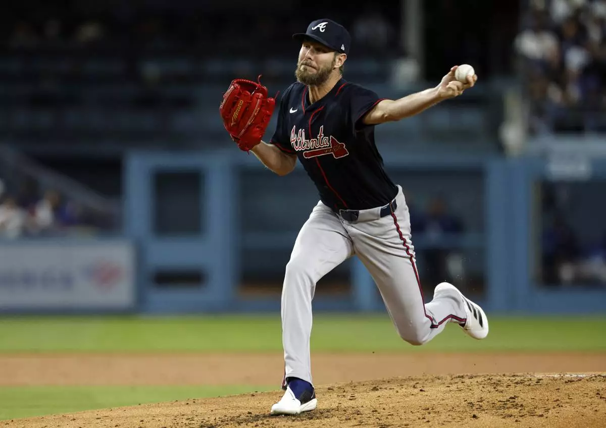 Atlanta Braves' Chris Sale throws against the Los Angeles Dodgers during the second inning of a baseball game Tuesday, April 1, 2025, in Los Angeles. (AP Photo/Kevork Djansezian)