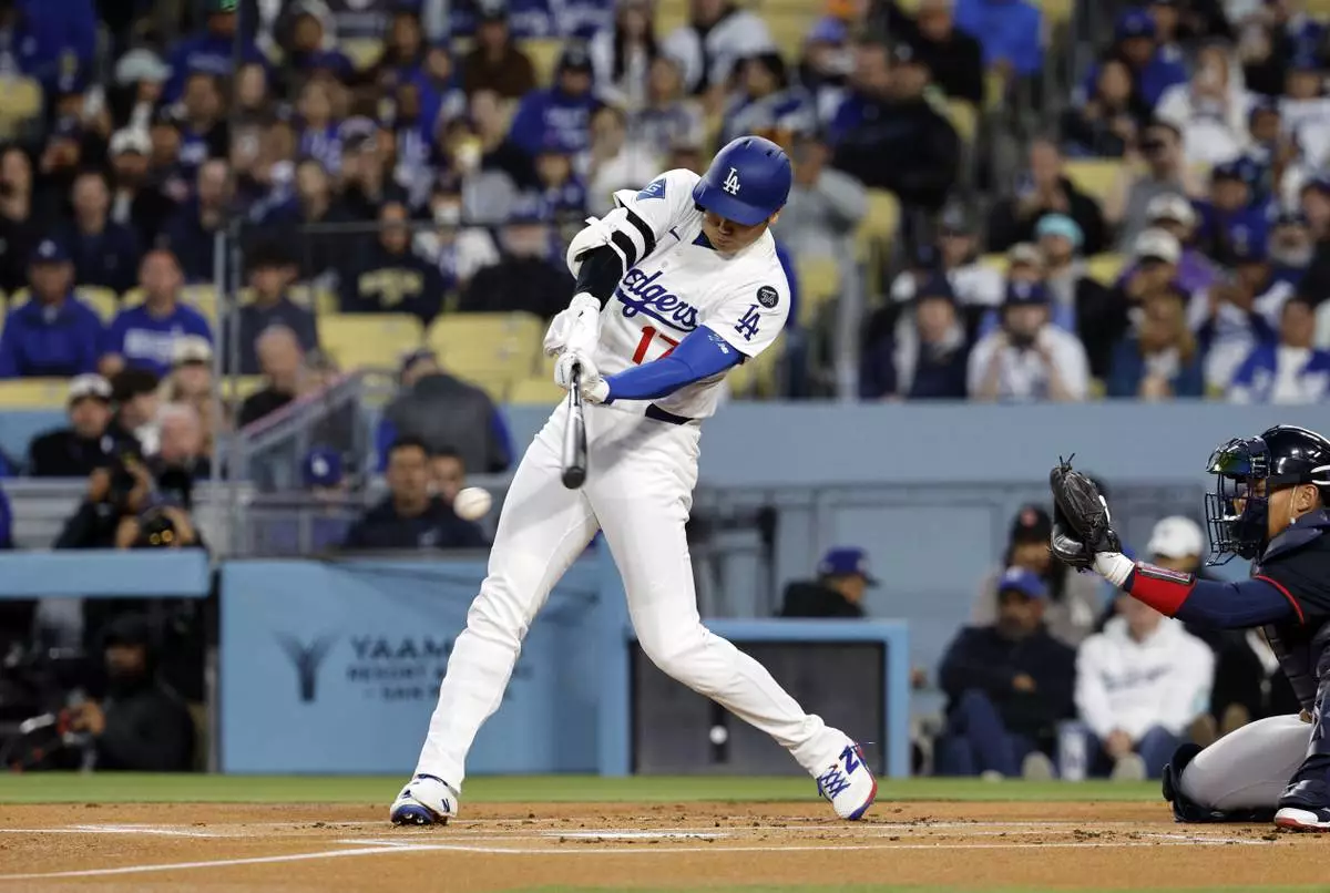 Los Angeles Dodgers' Shohei Ohtani hits a ground out against the Atlanta Braves during the first inning of a baseball game Tuesday, April 1, 2025, in, Los Angeles. (AP Photo/Kevork Djansezian)