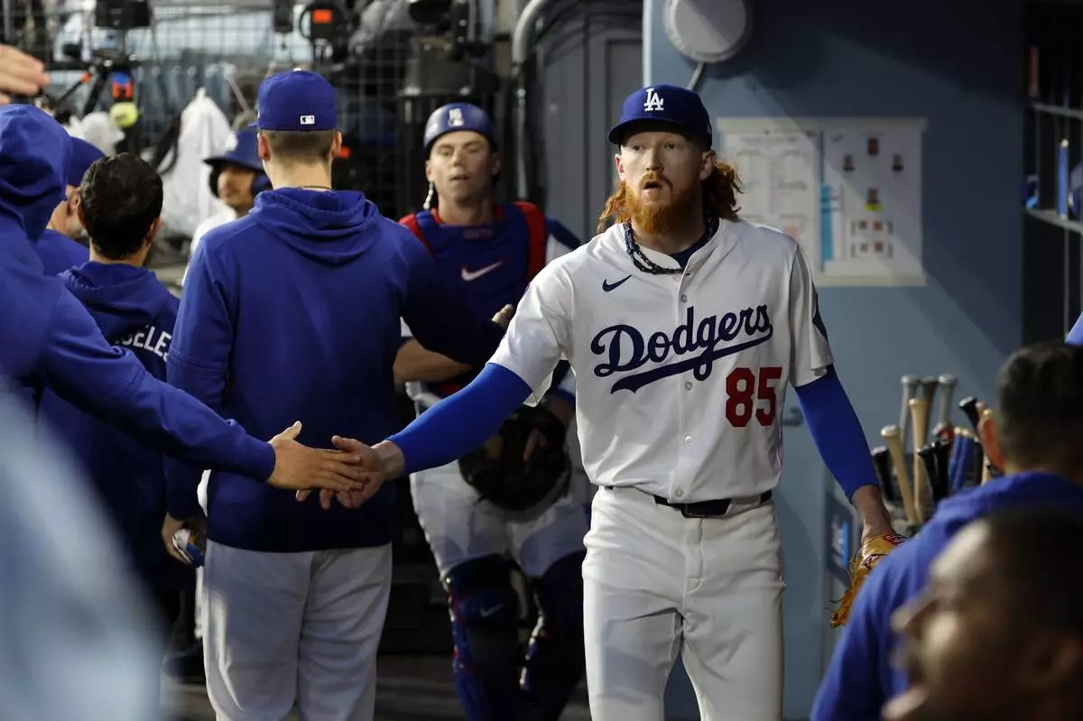 Los Angeles Dodgers' Dustin May is congratulated in the dugout after striking out the side against the Atlanta Braves during the first inning of a baseball game Tuesday, April 1, 2025, in Los Angeles. (AP Photo/Kevork Djansezian)