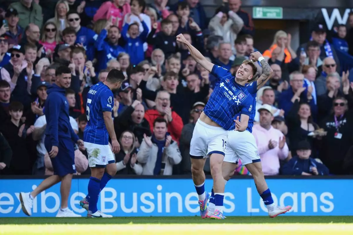 Ipswich Town's Liam Delap celebrates scoring his side's first goal of the game, during the English Premier League soccer match between Ipswich Town and Wolverhampton Wanderers, at Portman Road, in Ipswich, England, Saturday, April 5, 2025. (Bradley Collyer/PA via AP)