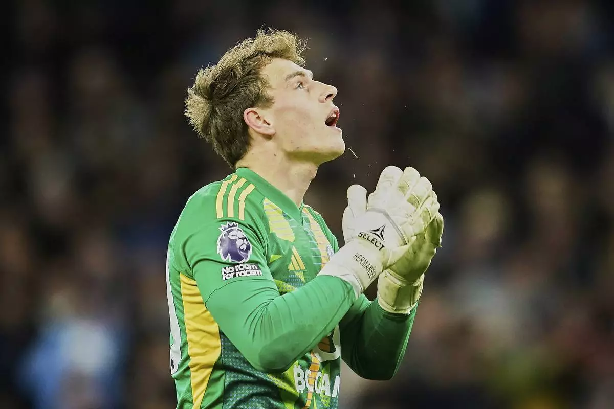 Leicester's goalkeeper Mads Hermansen reacts after receiving a second goal during the English Premier League soccer match between Manchester City and Leicester City at the Etihad stadium in Manchester, England, Wednesday, April 2, 2025. (AP Photo/Dave Thompson)