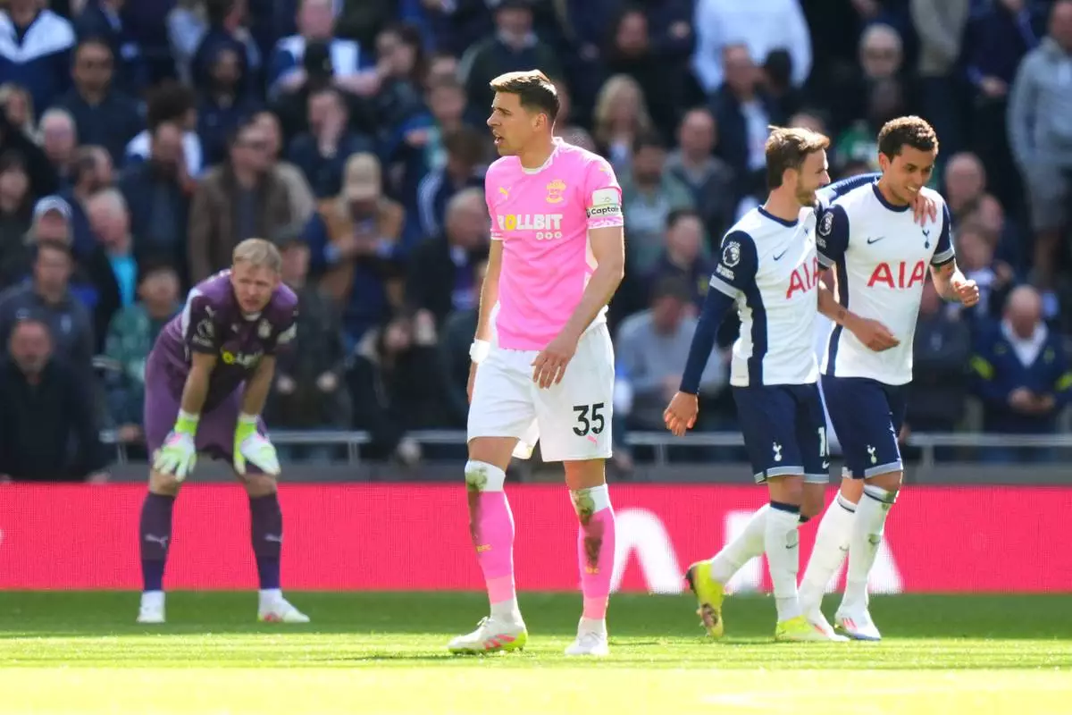 Southampton goalkeeper Aaron Ramsdale, background left and Jan Bednarek foreground react after Tottenham Hotspur's Brennan Johnson, right, scored his side's second goal of the game as he celebrates with teammate James Maddison, during the English Premier League soccer match between Tottenham Hotspur and Southampton at Tottenham Hotspur Stadium, in London, Sunday April 6, 2025. (Bradley Collyer/PA via AP)