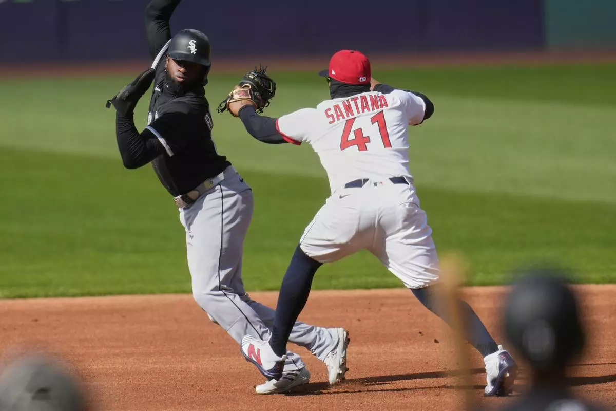 Chicago White Sox's Luis Robert Jr., left, is tagged out by Cleveland Guardians first baseman Carlos Santana (41) between first and second base on an attempted steal in the first inning of a baseball game in Cleveland, Tuesday, April 8, 2025. (AP Photo/Sue Ogrocki)