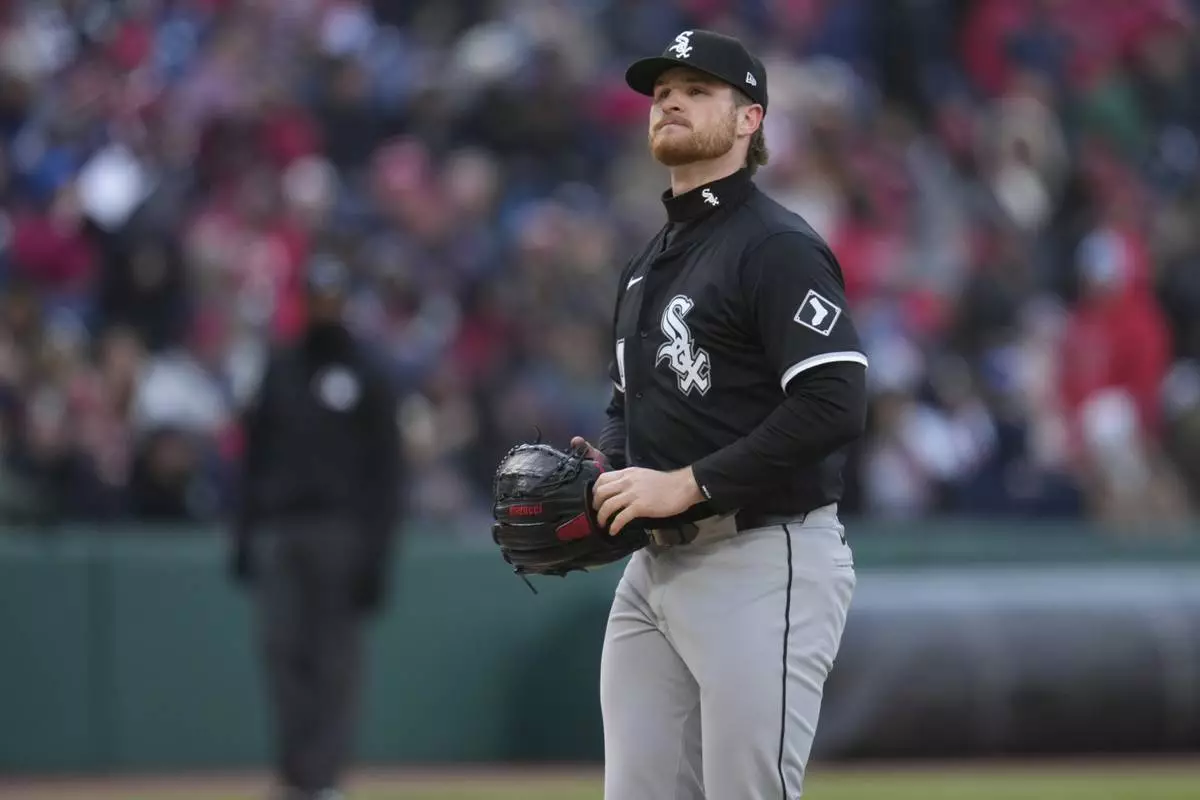 Chicago White Sox pitcher Shane Smith reacts after Cleveland Guardians' José Ramírez hit a single in the sixth inning of a baseball game in Cleveland, Tuesday, April 8, 2025. (AP Photo/Sue Ogrocki)