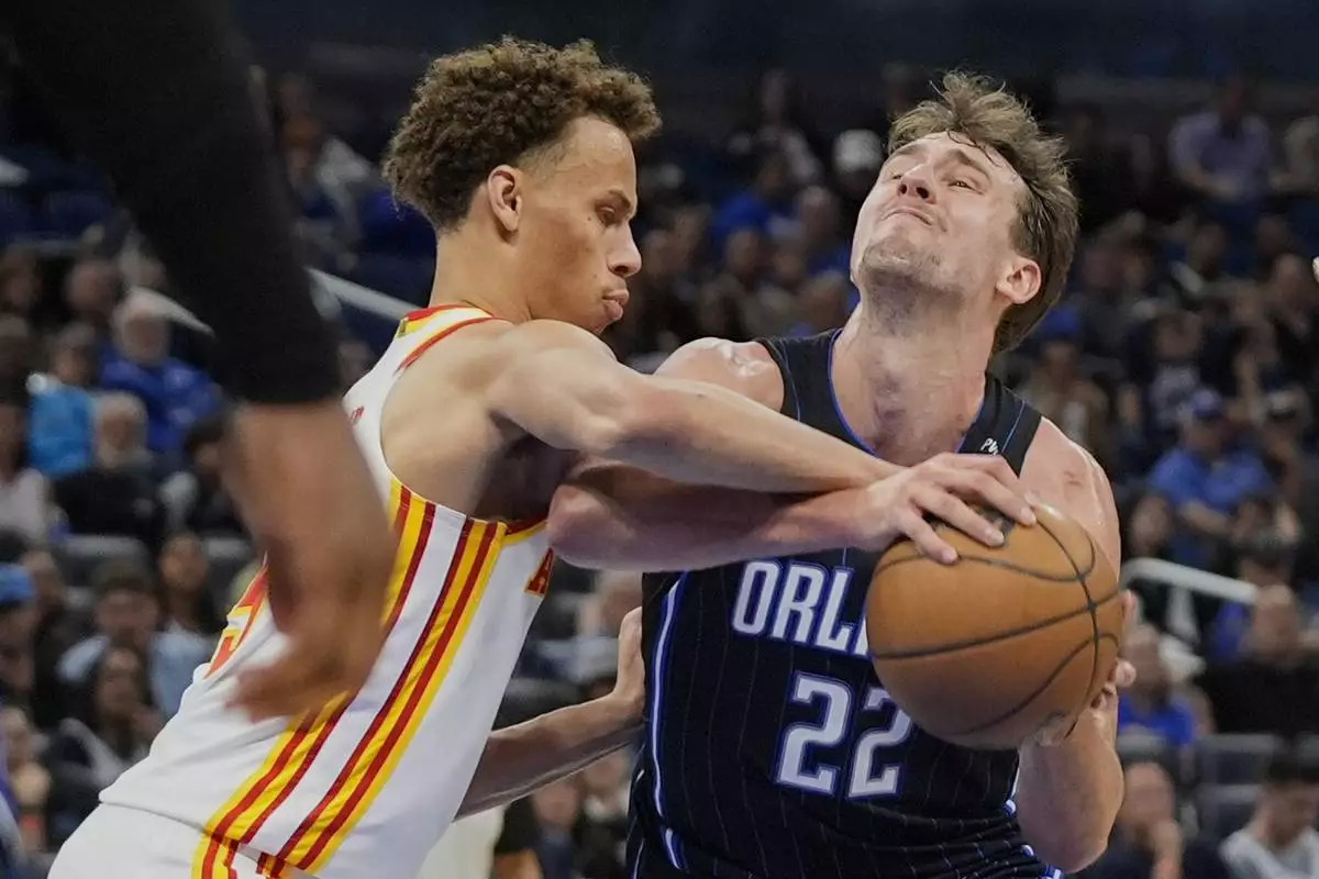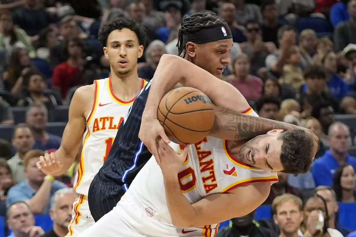 Atlanta Hawks guard Dyson Daniels, left, fouls Orlando Magic forward Franz Wagner (22) as he attempts a shot during the second half of an NBA basketball game, Tuesday, April 8, 2025, in Orlando, Fla. (AP Photo/John Raoux)