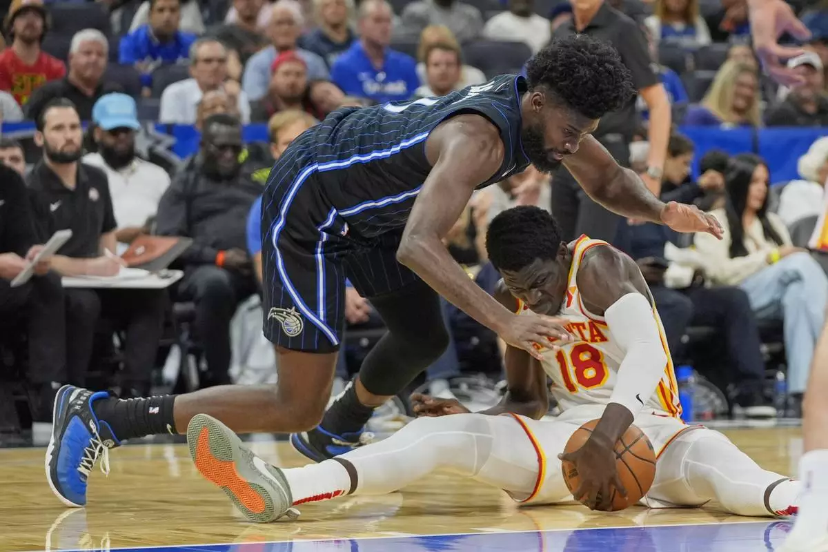 Atlanta Hawks forward Mouhamed Gueye (18) and Orlando Magic forward Jonathan Isaac, left, battle for a loose ball during the second half of an NBA basketball game, Tuesday, April 8, 2025, in Orlando, Fla. (AP Photo/John Raoux)