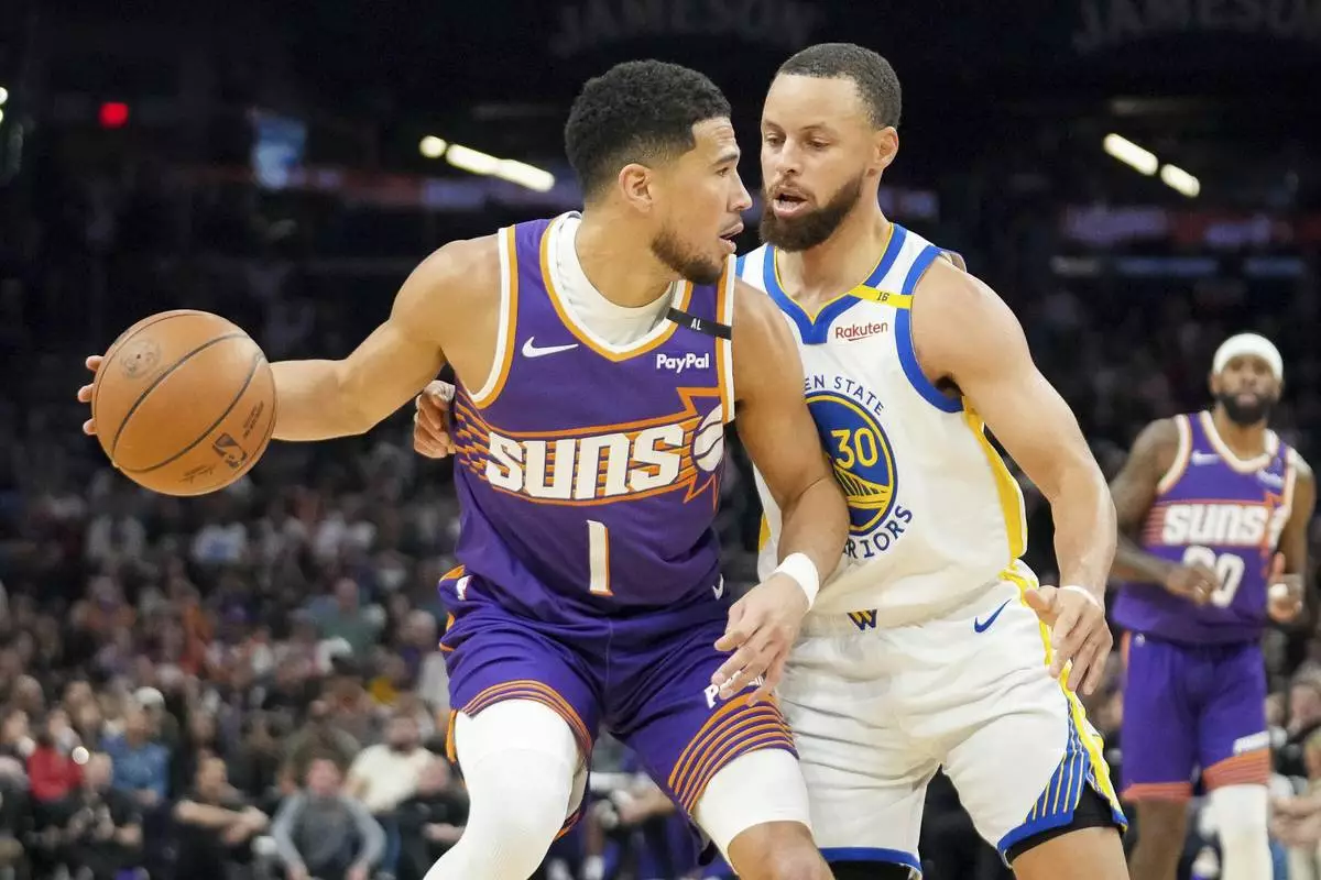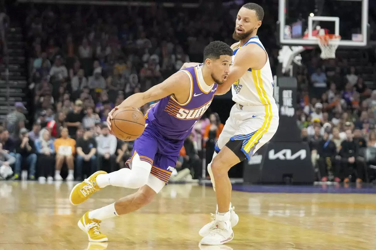 Phoenix Suns guard Devin Booker (1) is guarded by Golden State Warriors guard Stephen Curry, right, during the first half of an NBA basketball game in Phoenix, Tuesday, April 8, 2025. (AP Photo/Darryl Webb)