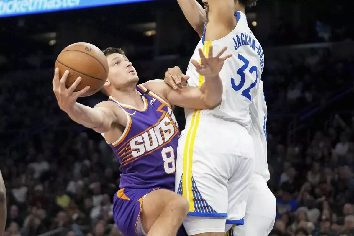 Phoenix Suns guard Grayson Allen (8) attempts to shoot around Golden State Warriors forward Trayce Jackson-Davis (32) during the first half of an NBA basketball game in Phoenix, Tuesday, April 8, 2025. (AP Photo/Darryl Webb)