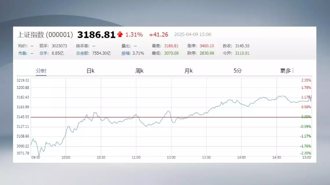 The benchmark Shanghai Composite Index rose 1.31 percent and closed at 3,186.81 points, while the Shenzhen Component Index closed 1.22 percent higher at 9,539.89 points.