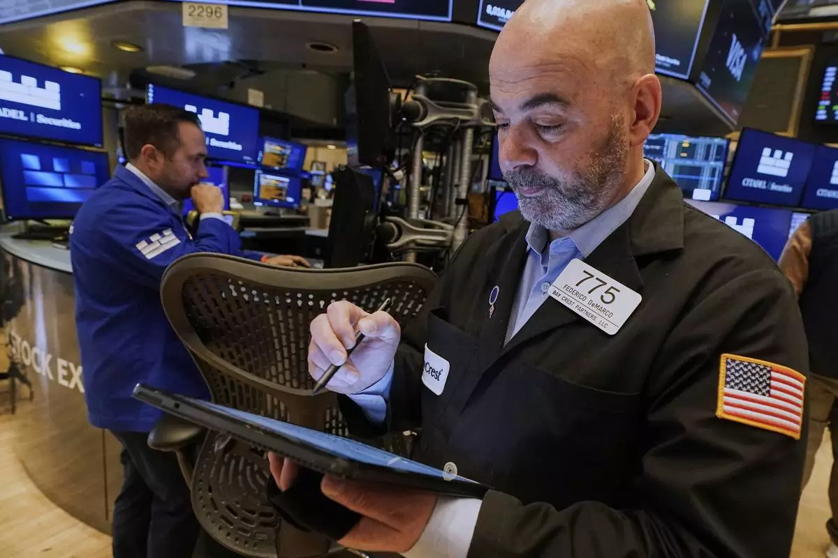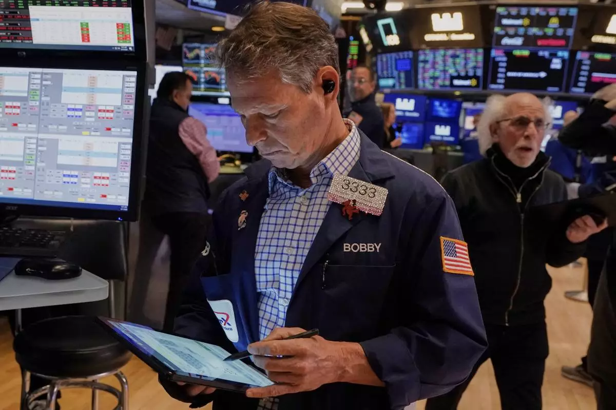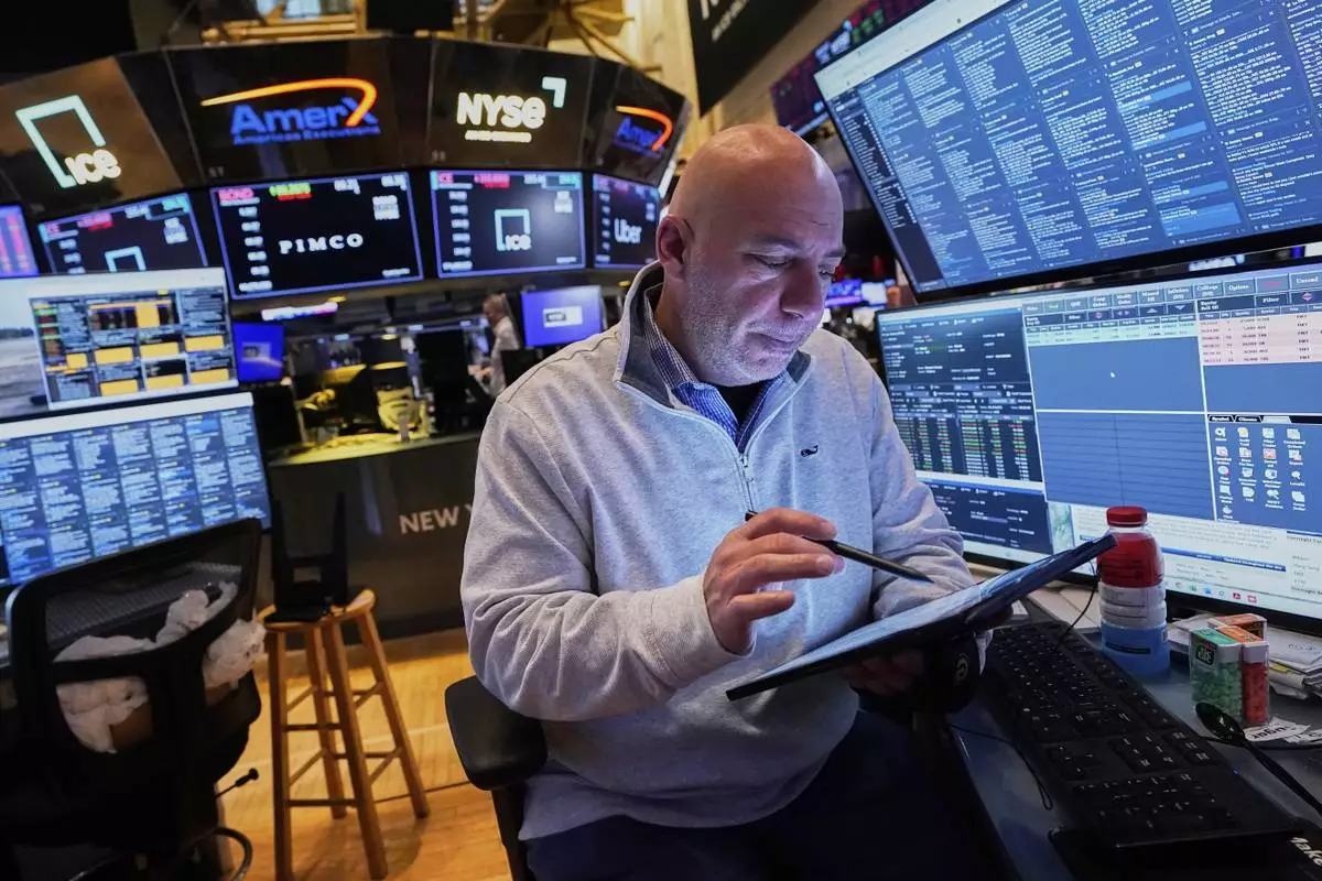 Specialist Anthony Matesic works at his post on the floor of the New York Stock Exchange, Friday, April 11, 2025. (AP Photo/Richard Drew)