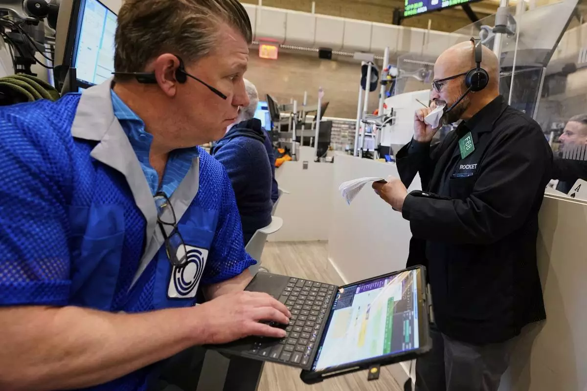 Trader Patrick Casey, left, and specialist Jamie Denaro work on the floor of the New York Stock Exchange, Friday, April 11, 2025. (AP Photo/Richard Drew)
