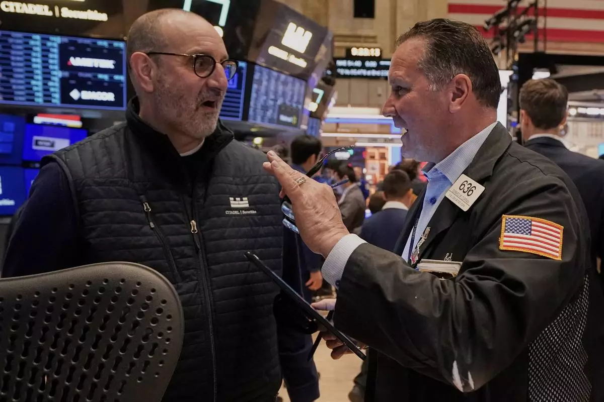 Specialist Thomas Schreck, left, talks with a colleague on the floor of the New York Stock Exchange, Friday, April 11, 2025. (AP Photo/Richard Drew)