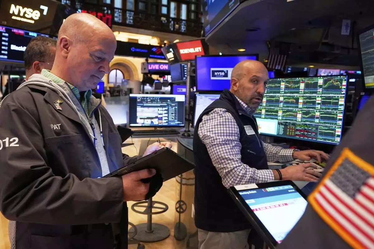 Specialist Thomas McArdle, right, works at his post on the floor of the New York Stock Exchange, Friday, April 11, 2025. (AP Photo/Richard Drew)