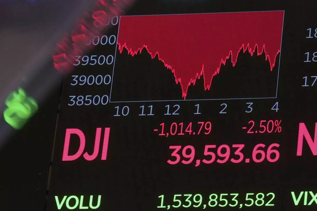 A board above the trading floor of the New York Stock Exchange shows the closing number for the Dow Jones industrial average, Thursday, April 10, 2025. (AP Photo/Richard Drew)