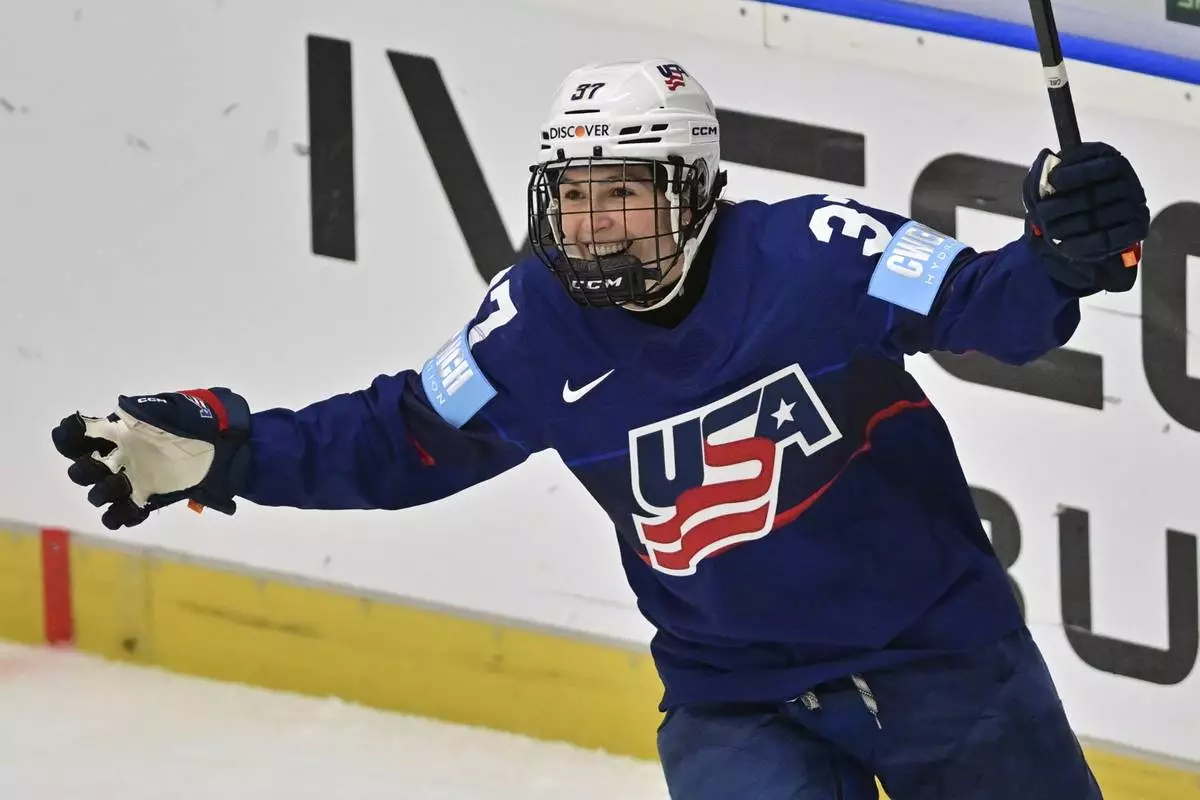 United States' Abbey Murphy celebrates a goal against the Czech Republic during a Group A match at the women's world ice hockey championships, Friday, April 11, 2025, in Ceske Budejovice, Czech Republic. (Vaclav Pancer/CTK via AP)