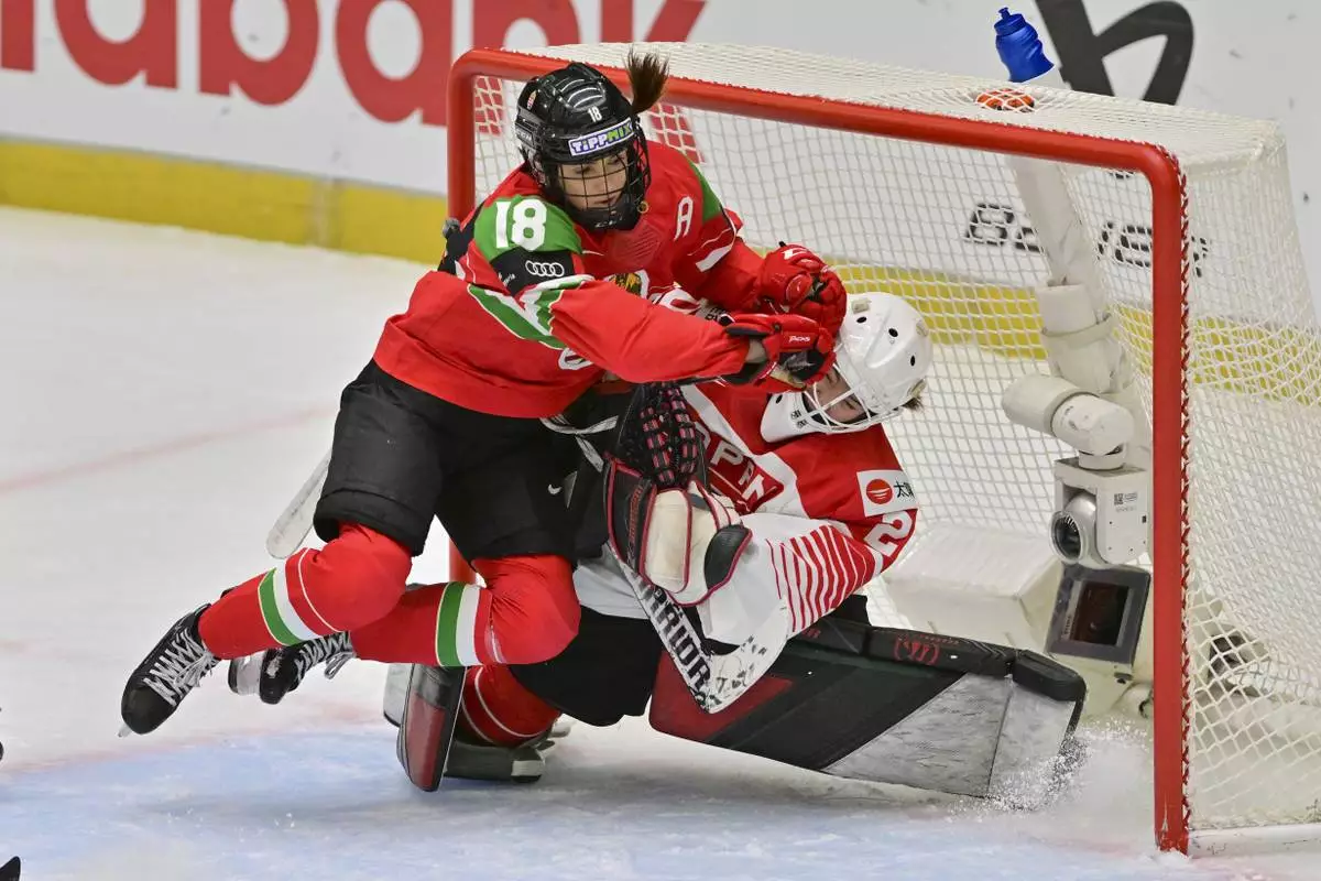 Alexandra Huszák of Hungary, left, and goalkeeper Miyuu Masuhara of Japan in action during the IIHF Women's World Championship, Group B, match between Hungary and Japan, in Ceske Budejovice, Czech Republic, Friday, April 11, 2025. (Vaclav Pancer/CTK via AP)