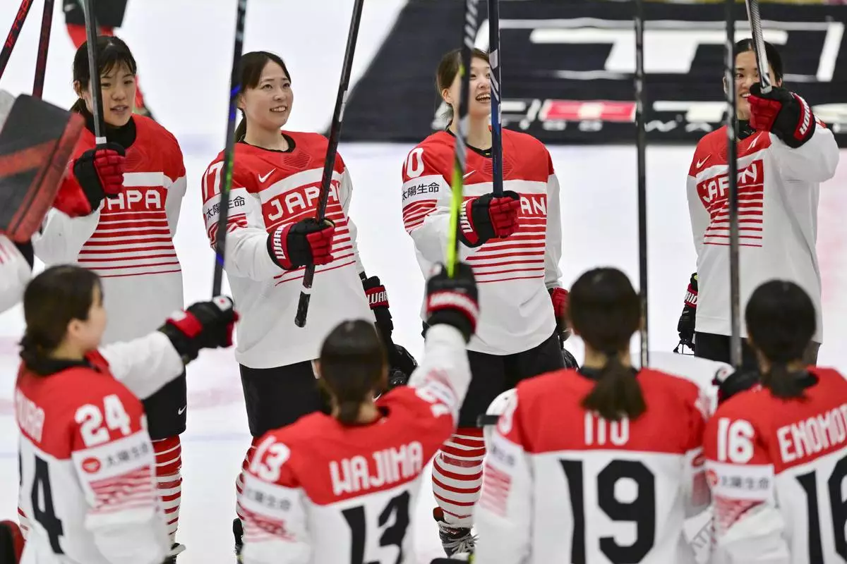 Japanese players celebrate their victory after the IIHF Women's World Championship, Group B, match between Hungary and Japan, in Ceske Budejovice, Czech Republic, Friday, April 11, 2025. (Vaclav Pancer/CTK via AP)