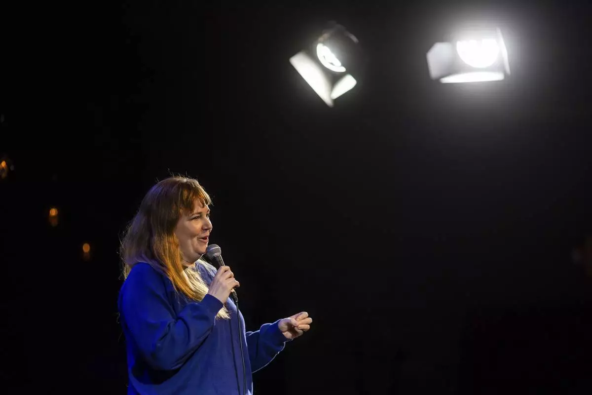 Ashley Brooke Roberts performs during Stand Up For Climate, a comedy show at Flappers Comedy on Thursday, March 20, 2025, in Burbank, Calif. (AP Photo/Ethan Swope)