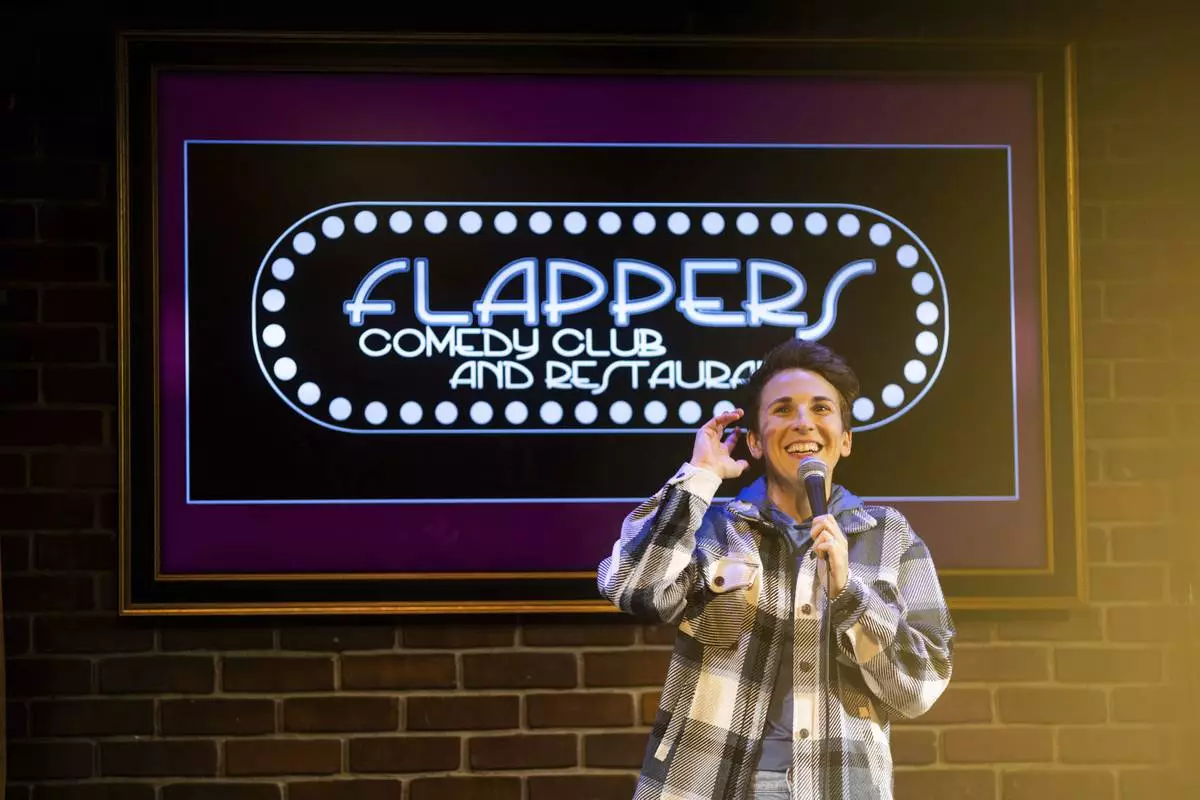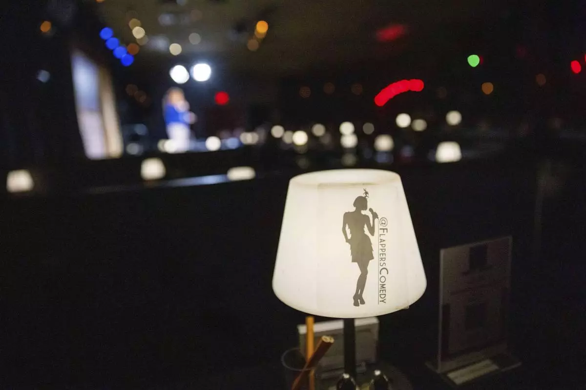 A light with the name Flappers Comedy is visible as Ashley Brooke Roberts performs during Stand Up For Climate on Thursday, March 20, 2025, in Burbank, Calif. (AP Photo/Ethan Swope)