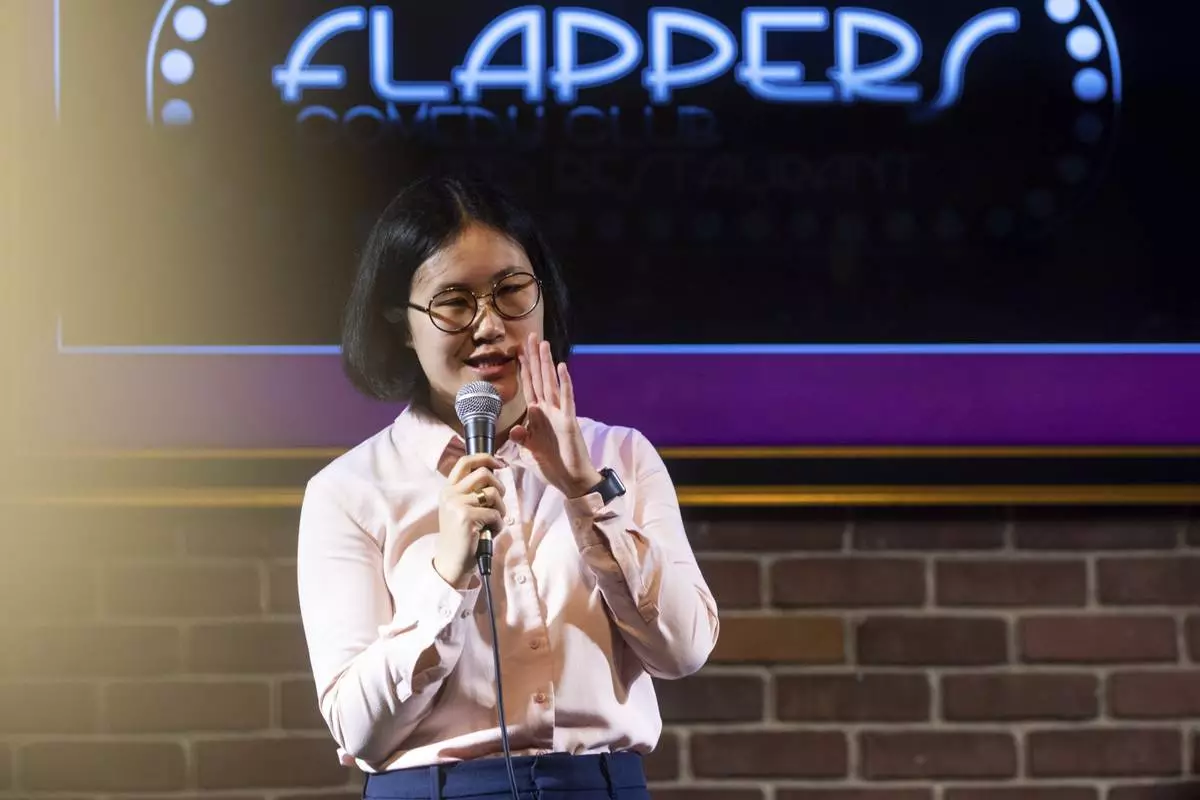 Corinna Yee performs during Stand Up For Climate, a comedy show at Flappers Comedy on Thursday, March 20, 2025, in Burbank, Calif. (AP Photo/Ethan Swope)