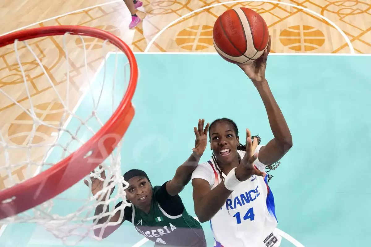 FILE - France's Dominique Malonga, right, shoots as Nigeria's Amy Elizabeth Balogun defends in a women's basketball game at the 2024 Summer Olympics, Aug. 1, 2024, in Villeneuve-d'Ascq, France. (AP Photo/Michael Conroy, Pool File)