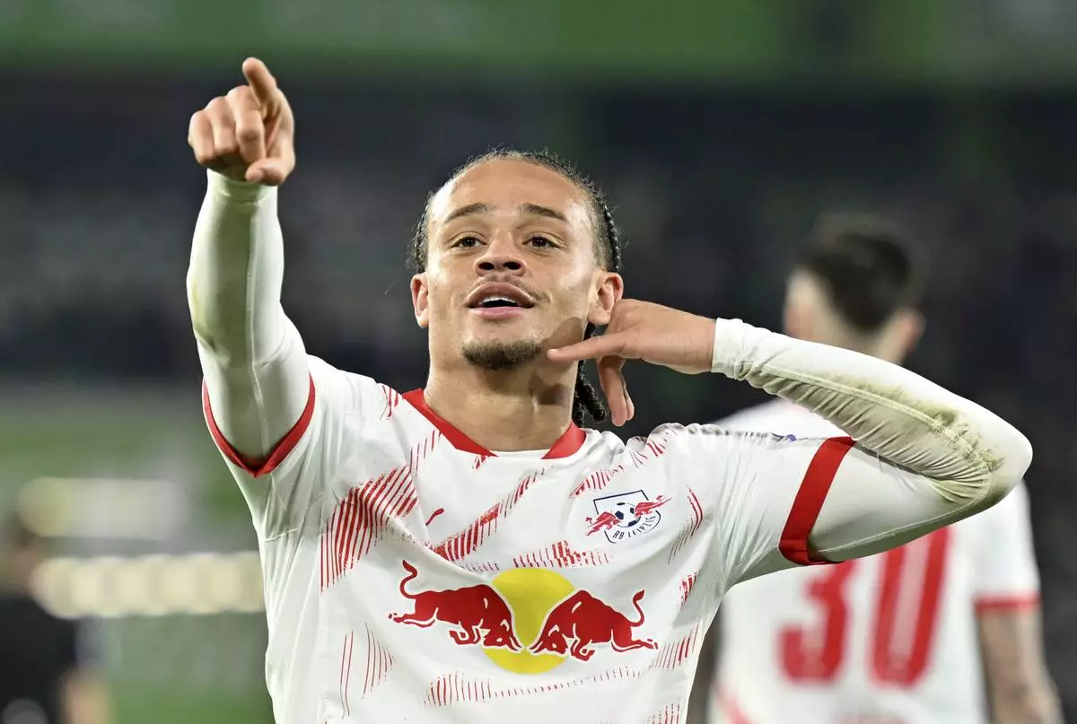 Leipzig's Xavi Simons celebrates scoring during the Bundesliga soccer match between VfL Wolfsburg and RB Leipzig at Volkswagen Arena, Wolfsburg, Germany, Friday April 11, 2025. (Swen Pf'rtner/dpa via AP)