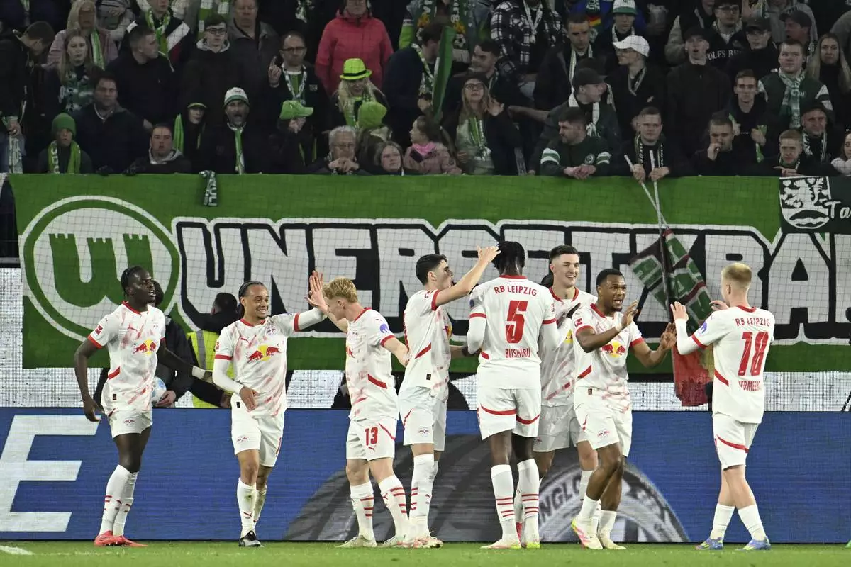 Leipzig's Xavi Simons, second left, celebrates scoring during the Bundesliga soccer match between VfL Wolfsburg and RB Leipzig at Volkswagen Arena, Wolfsburg, Germany, Friday April 11, 2025. (Swen Pf'rtner/dpa via AP)