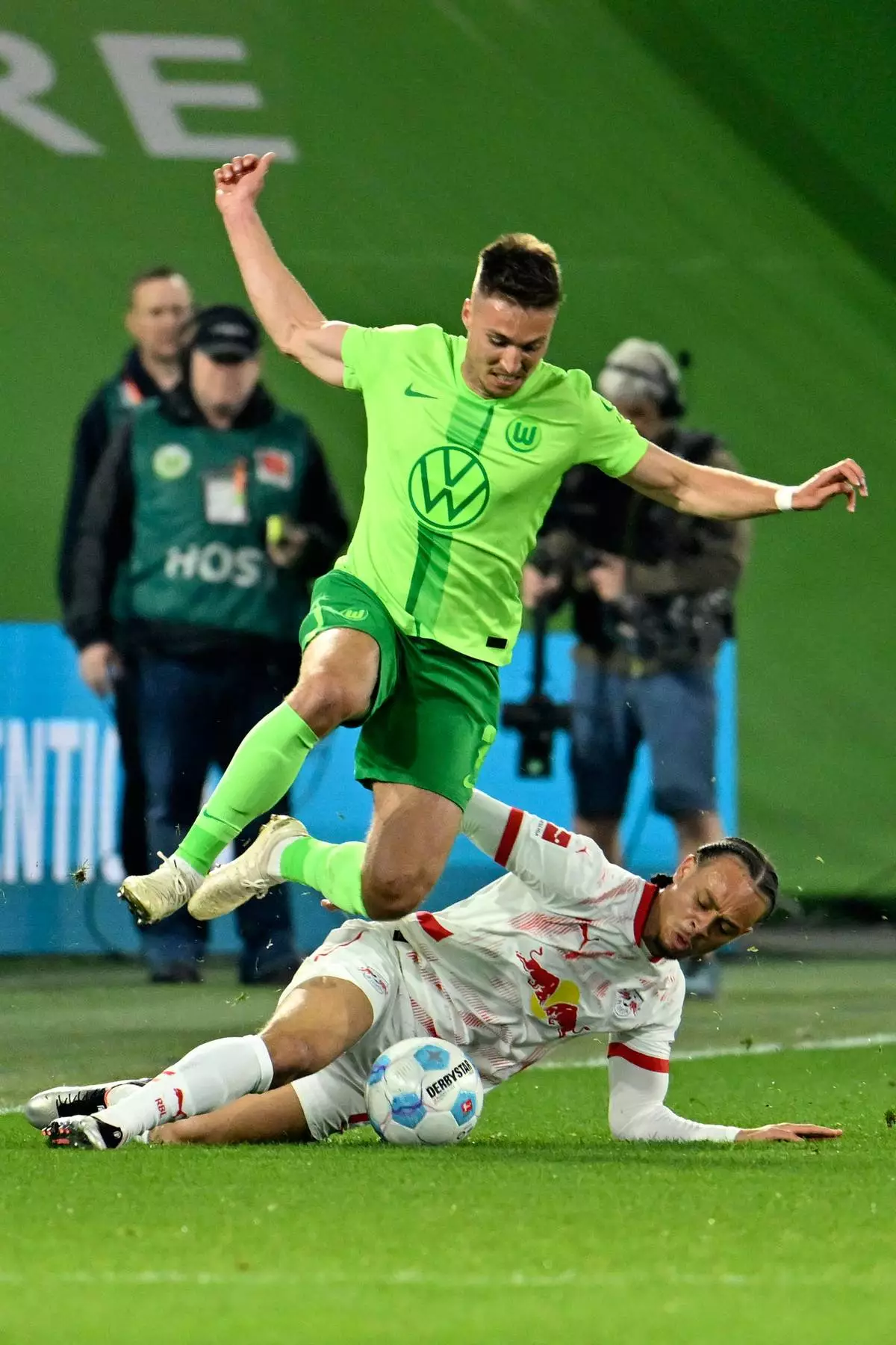 Wolfsburg's Kilian Fischer, left, and Leipzig's Xavi Simons in action during the Bundesliga soccer match between VfL Wolfsburg and RB Leipzig at Volkswagen Arena, Wolfsburg, Germany, Friday April 11, 2025. (Swen Pf'rtner/dpa via AP)