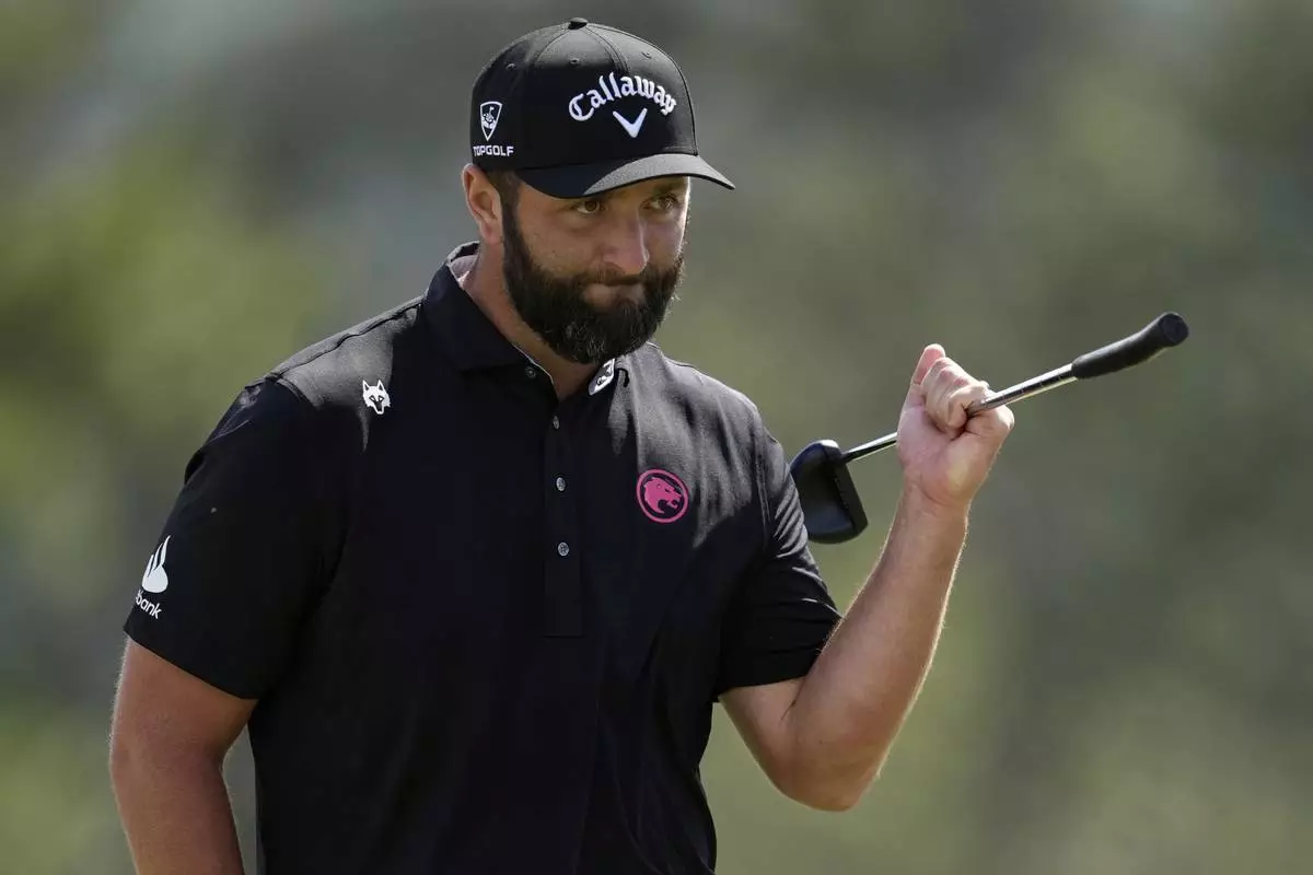 Jon Rahm, of Spain, waves after making a putt on the 18th hole during the second round at the Masters golf tournament, Friday, April 11, 2025, in Augusta, Ga. (AP Photo/George Walker IV)