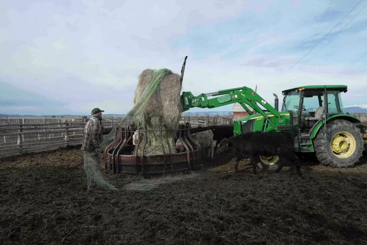 Philip Anderson pulls plastic off a bale of hay, Tuesday, March 31, 2026, in Walden, Colo. (AP Photo/Brittany Peterson)