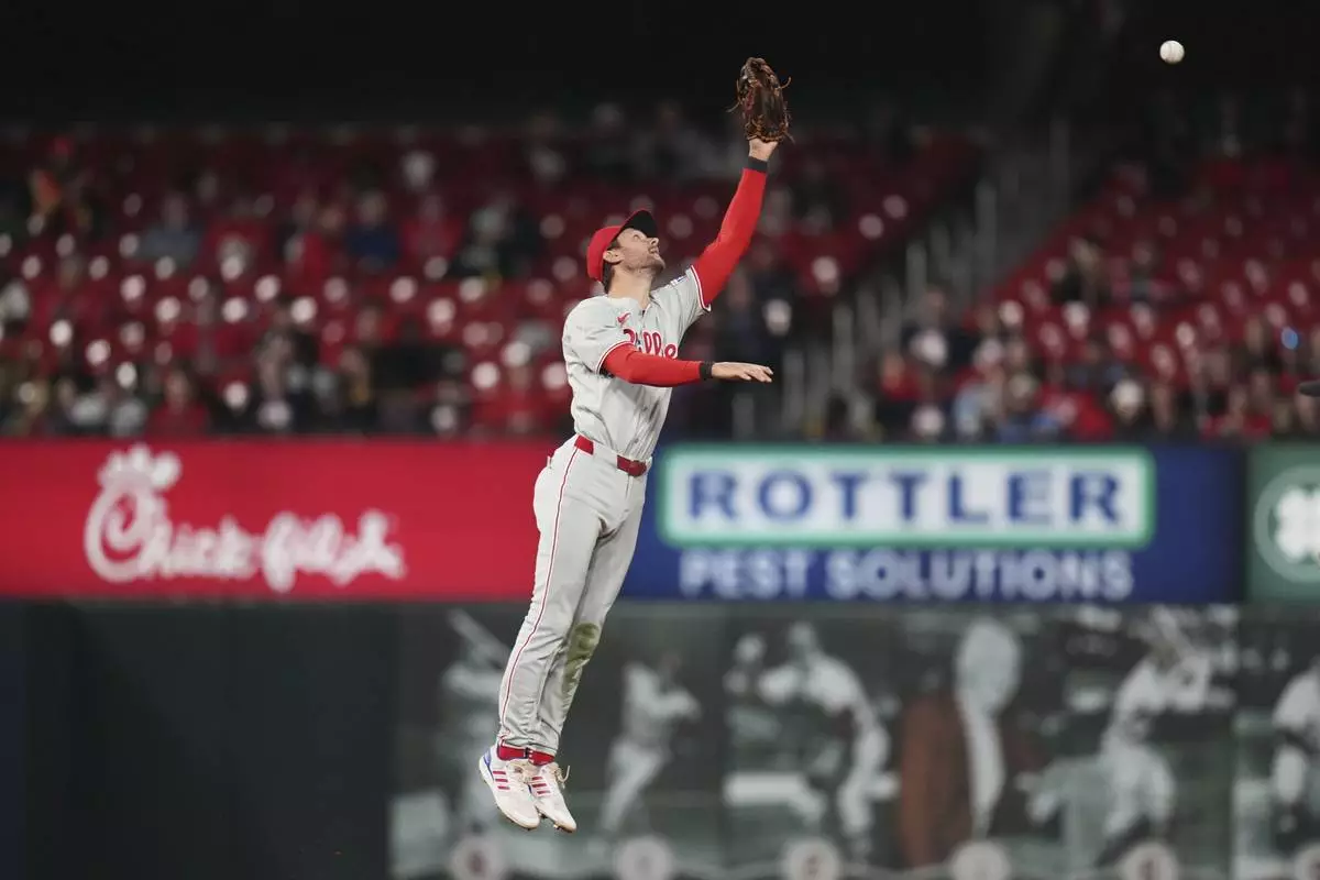 Philadelphia Phillies second baseman Bryson Stott reacts after being unable to catch a single by St. Louis Cardinals' Yohel Pozo during the sixth inning of a baseball game Friday, April 11, 2025, in St. Louis. (AP Photo/Jeff Roberson)