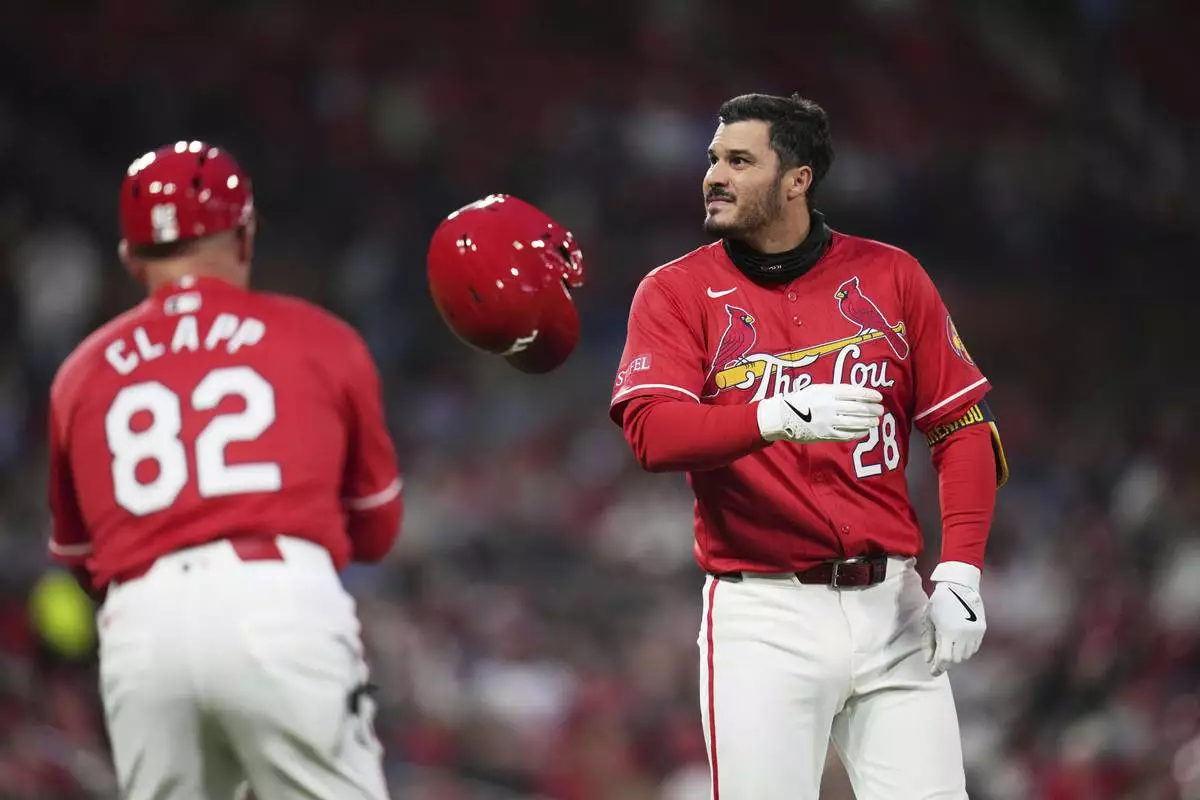 St. Louis Cardinals' Nolan Arenado (28) tosses his helmet to first base coach Stubby Clapp (82) after flying out to end the first inning of a baseball game against the Philadelphia Phillies Friday, April 11, 2025, in St. Louis. (AP Photo/Jeff Roberson)